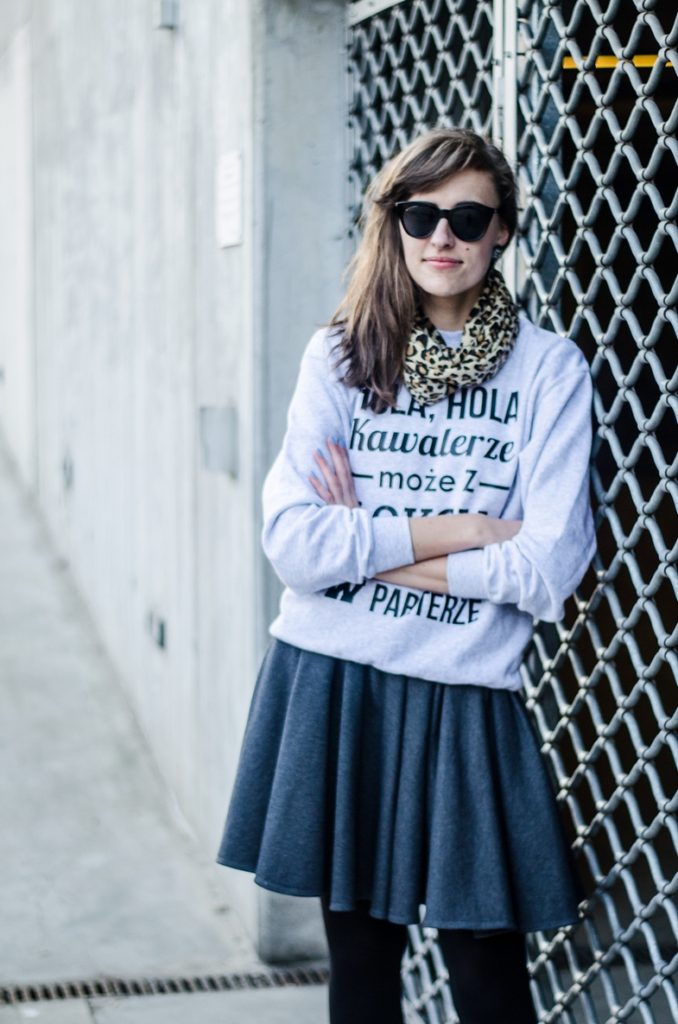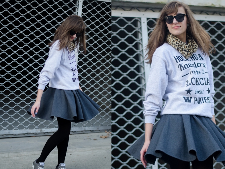 okulary przeciwsłoneczne / sunglasses: Le Specs via zalando.pl | kolczyki / earrings: Aldo | szal / scarf: Aldo | kurtka / jacket: Pull&Bear | bluza / sweatshirt: Łap nasz kubek (ojj teraz takie nowe fajne modele! Panią mądralińską i najpiękniejszą w całej wsi poproszę!) | spódnica / skirt: Boom Bloom | torebka / bag: prezent/gift | buty / shoes: Converse via zalando.pl