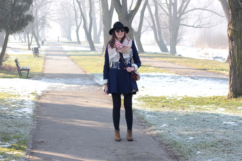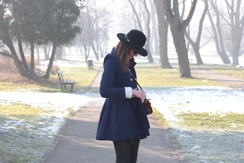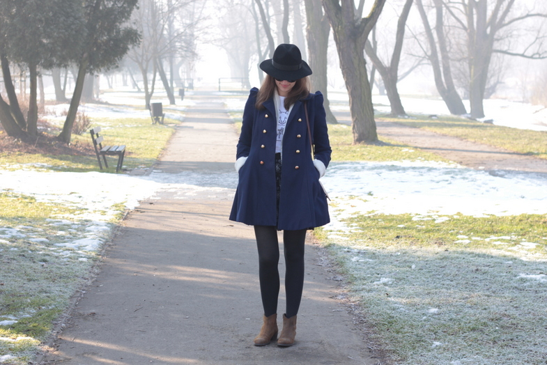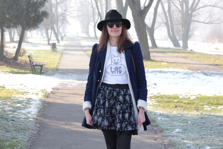 kapelusz / hat: HATHAT | szal / scarf: H&M | płaszcz / coat: NEW LOOK | t-shirt: LAS | spódnica / skirt: NEW LOOK sh | buty / shoes: KICKERS | torebka / bag: od Mamy / from Mum