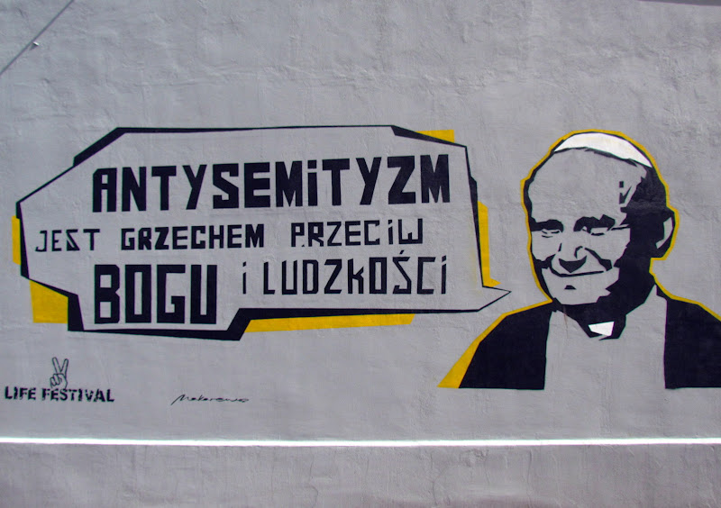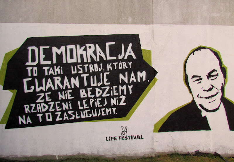 Live Festival Oświęcim, którego główną częścią są koncerty (w tym roku wystąpił m.in. Peter Gabriel, w zeszłym James Blunt) to nie tylko wdarzenie kulturalne, ale też po części edukacyjne. I tak prócz paneli dyskusyjnych, wystaw, w kilku punktach miasta powstały „gadające głowy” graffiti z wizerunkami znanych osób, m.in. Marii Skłodowskiej-Curie, Jana Pawła II, Vaclava Havla czy Mahatmy Gandhiego. Ale nie tylko dla tego corocznego wydarzenia tworzone są tytułowe graffiti z przesłaniem, chyba muszę poszukać jeszcze więcej takich miejsc 🙂