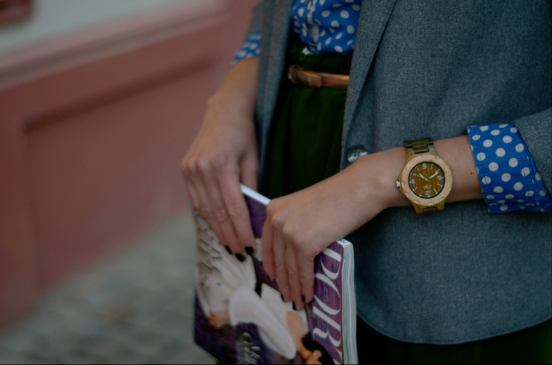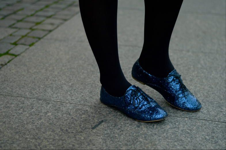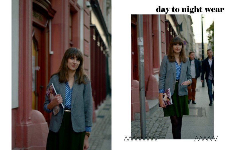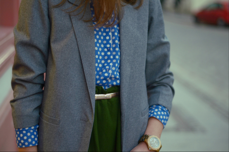 Granatowe buty z brokatu kupiłam co prawda z myślą o weselnej kreacji, ale też i z zamysłem wykorzystywania ich przy innych okazjach. Teraz noszę je bardzo często! Tym razem zestawiłam je ze spódnicą uszytą przez moją Babcię. Wykonana została z zielonego materiału przypominającego welur. Mogłabym resztę dobrać czarną, ale wolałam podkręcić tę stylizację błękitną koszulą w grochy i szarą marynarką o prostej linii. Taki żakiet „gubi talię”, więc dość ryzykowne jest noszenie go do rozkloszowanych spódnic, bo może nam się zrobić taki optycznie ciężki kielich. Do całości dobrałam drewniany zegarek i brunatną torebkę oraz pasek z metalicznym połyskiem w kolorze białego złota. Jeśli jesteście wysokie, tak jak ja, tego typu torba zrównoważy luźny żakiet i spódnicę. Pasek zwraca uwagę na talię.