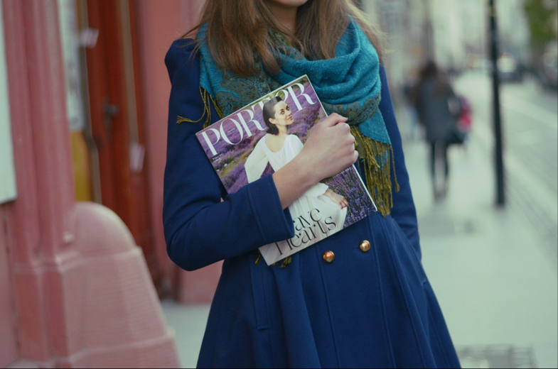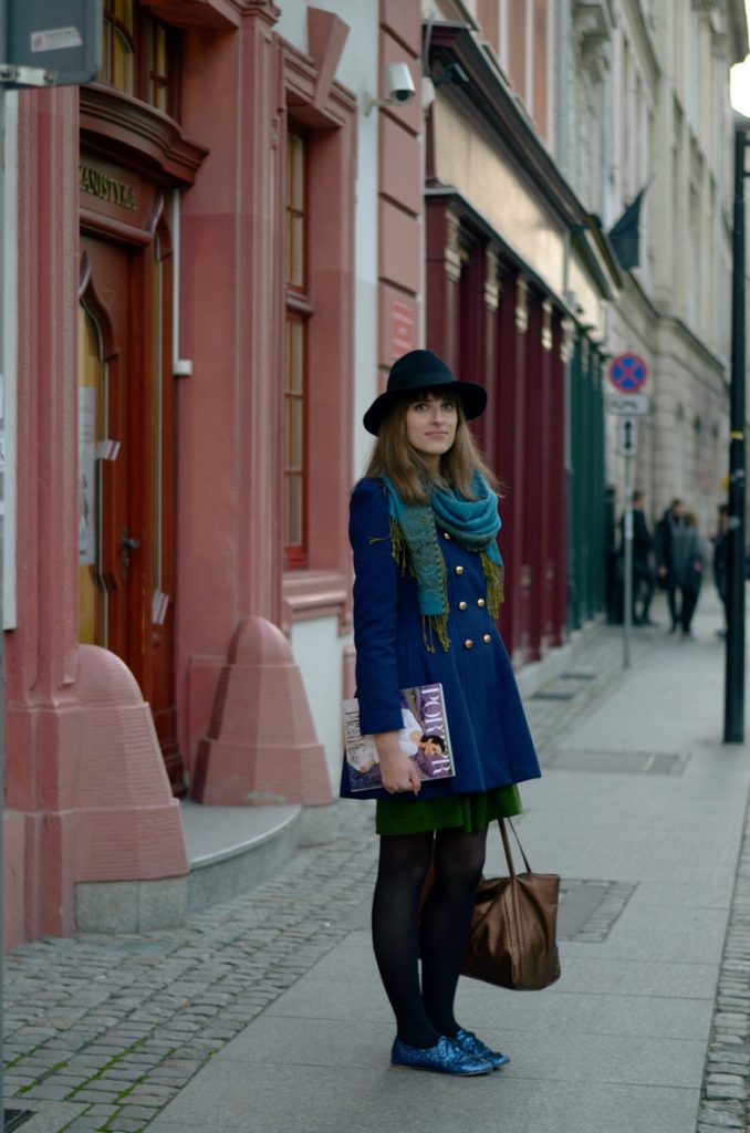 Stali czytelnicy na pewno bardzo dobrze znają już ten granatowy płaszcz. Kupiłam go parę lat temu w New Look’u i mimo tego, że jest to jedna z sieciówek, która nie może się pochwalić zwalającą z nóg jakością swoich produktów, to płaszcz trzyma się naprawdę dobrze. Mam nadzieję, że gdy będę musiała się z nim rozstać, to znajdę coś o podobnym kroju. Ten model podkreśla ramiona i talię, a dzięki dużemu rozkloszowaniu pozwala ukryć szersze biodra czy uda. A dwurzędowe złote guziki dodają trochę twista temu pensjonarskiemu stylowi.