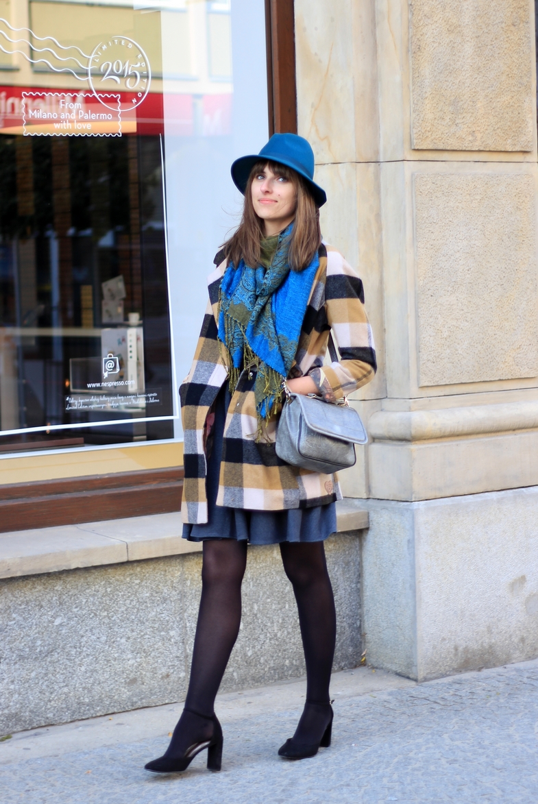 Całość uzupełniłam kapeluszem (Reporter, dzisiejsze Medicine), szalem, rozkloszowaną spódnicą, torebką od Mamy iiiii… tak dokładnie – butami na obcasie!