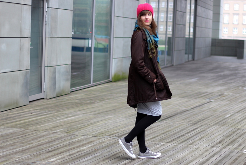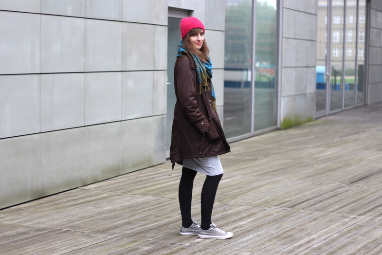 czapka / cap: F&F | kurtka / jacket: VERO MODA | sweter / sweater: BIK BOK SH | sukienka / dress: SINSAY | buty / shoes: CONVERSE