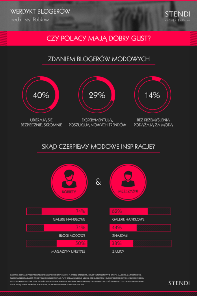 Moda ma znaczenie dla 57% badanych, 52% przyznaje, że dobrze orientuje się w trendach. 61% kobiet stwierdziło, że zna się na modzie, w przypadku mężczyzn było to tylko 37%. Ilu ludzi tyle opinii! Jakiś czas temu zostałam zaproszona przez Stendi.pl do udziału w badaniu co blogerzy sądzą na temat stylu Polaków. I patrząc na wyniki ARC Rynek i Opinie oraz te poprzednie, widzę kilka rozbieżności. Myślę, że przydałoby nam się porządne, duże badanie na reprezentatywnej grupie naszego narodu, najlepiej uzupełnione o indywidualne wywiady. Wtedy faktycznie można by było wysnuć wnioski, które mają sens i są przydatne nie tylko dla marek związanych z branżą mody, ale i socjologów, obserwujących nas jako jednostki w społeczeństwie i społeczeństwo jako całość. Wtedy Moda Polska 2014 stanowiłaby kompleksowe (w miarę możliwości) studium przypadku Polaka w gąszczu mody 😉