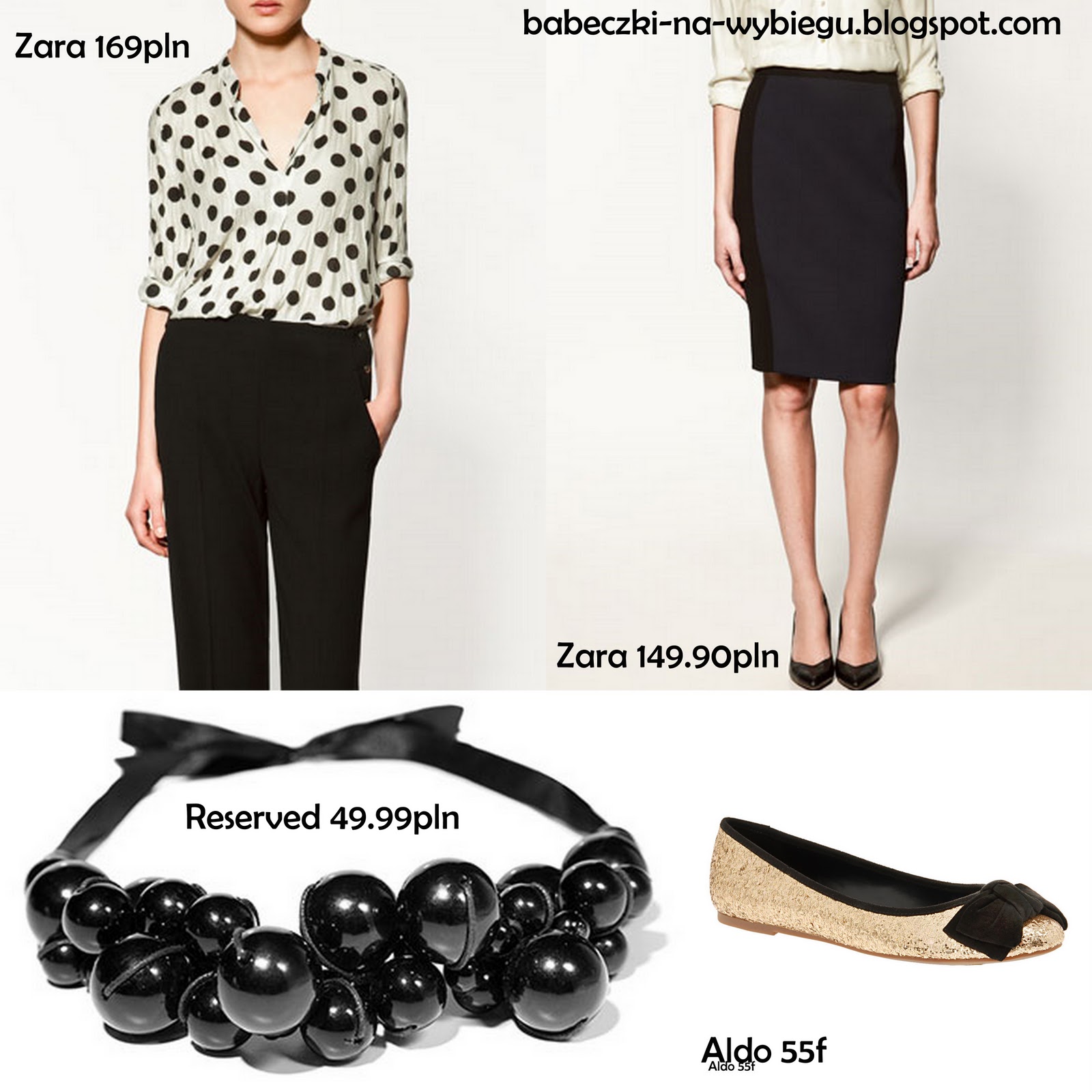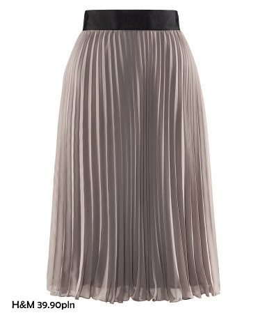 Modne groszki, granatowa spódnica z czarnymi pasami po bokach (wyszczuplają i wydłużają nogi!) to podstawa, jeśli chcemy wyglądać niestandardowo polecam założyć do nich złote balerinki i duży naszyjnik. Jeśli jednak nie odpowiada Wam takie połączenie wybierzcie proste czerwone lub czarne buty i delikatną złotą biżuterię.