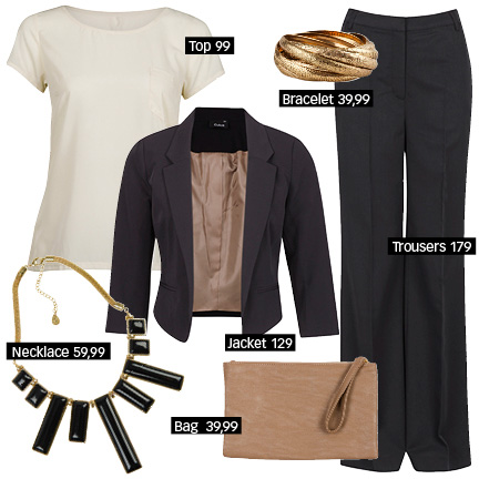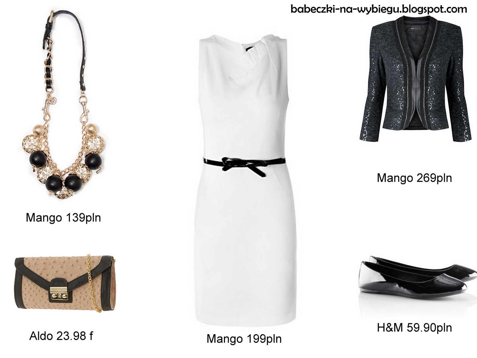 Jeden z moich faworytów (choć nie wiem czy biała sukienka to dobry pomysł na wigilijną wieczerzę – jeśli zachlapiemy ją barszczem… tragedia!) Klasyczna sukienka, doskonała do wykorzystania także latem, trendy błyszczący żakiet, proste balerinki i ciekawe dodatki – torebka+naszyjnik. Dla niektórych z Was pewnie za dużo się tu dzieje, jeśli wolicie nie rzucać się tak w oczy zrezygnujcie z naszyjnika i załóżcie matowe buty, bądź wybierzcie szary żakiet.