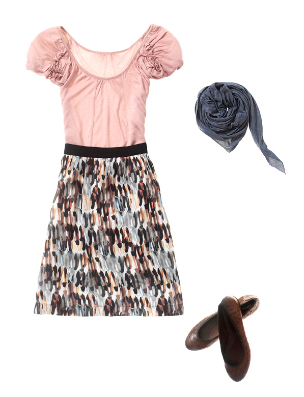 Strój tzw. „grzeczny”. Urocza biała bluzka, pastelowa spódnica i popielate buty to elementy, które z powodzeniem wykorzystamy przy wielu innych okazjach. Smaczku temu lookowi dodaje złoty zegarek i wsuwki do włosów.
