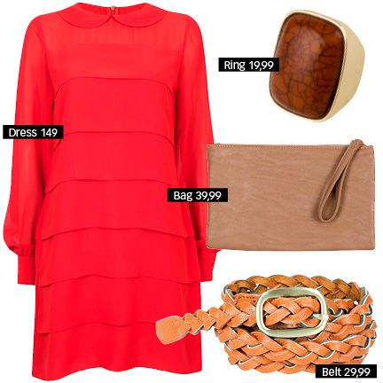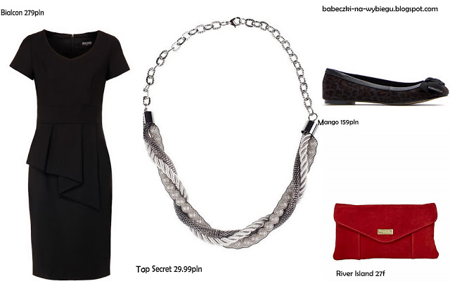 Dla wielbicielek czerni. Sukienka o ciekawym kroju (ukryje za duży brzuszek, a pięknie podkreśli nogi) z płaskimi butami w drapieżny wzór, które mimo to wyglądają klasycznie i są bardzo uniwersalne. Żeby nie było nudno czerwona kopertówka i naszyjnik.
