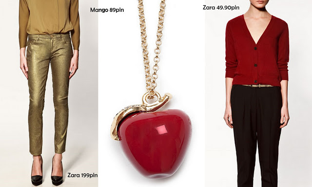Look dla odważnych – złote spodnie i czerwony sweterek plus naszyjnik. Tu trzeba uważać, żeby nie wyglądać jak przysłowiowa choinka. Dlatego warto zwrócić uwagę, że jeśli zakładacie tak wyraziste spodnie reszta stroju musi być bardziej stonowana – cielista lub czarna bluzka, proste szpilki.