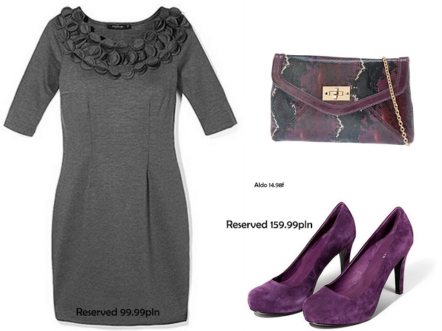 Klasyk czyli szara sukienka której wykończenie dekoltu nadaje niecodziennego charakteru połączona z fioletowymi szpilkami i kopertówką w wężowy wzór. Strój bezpieczny, ale nie nudny.