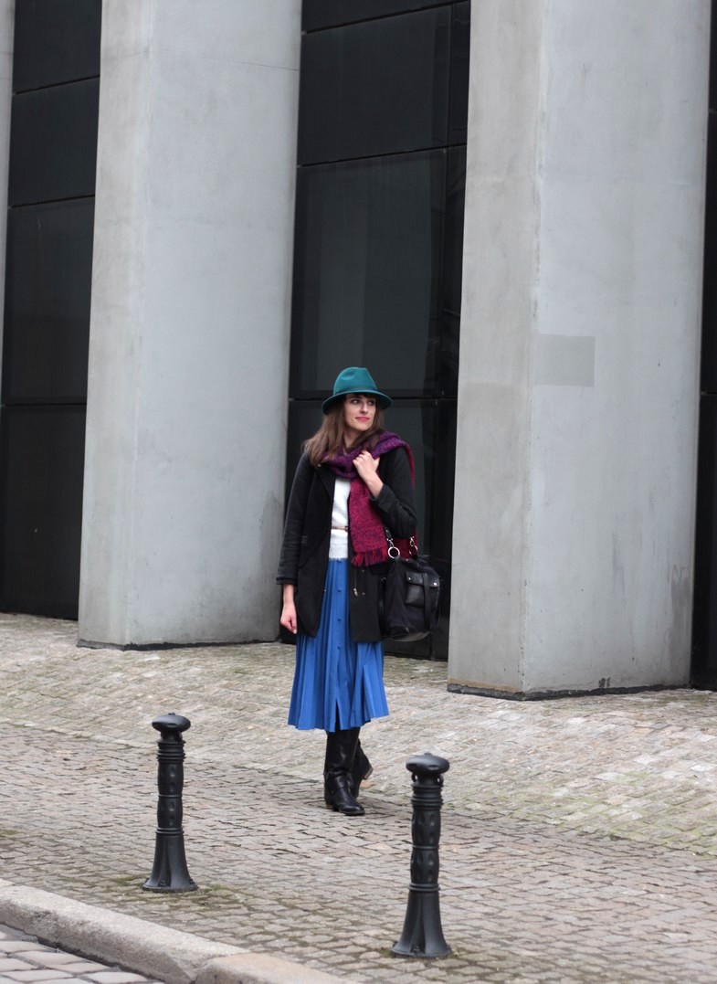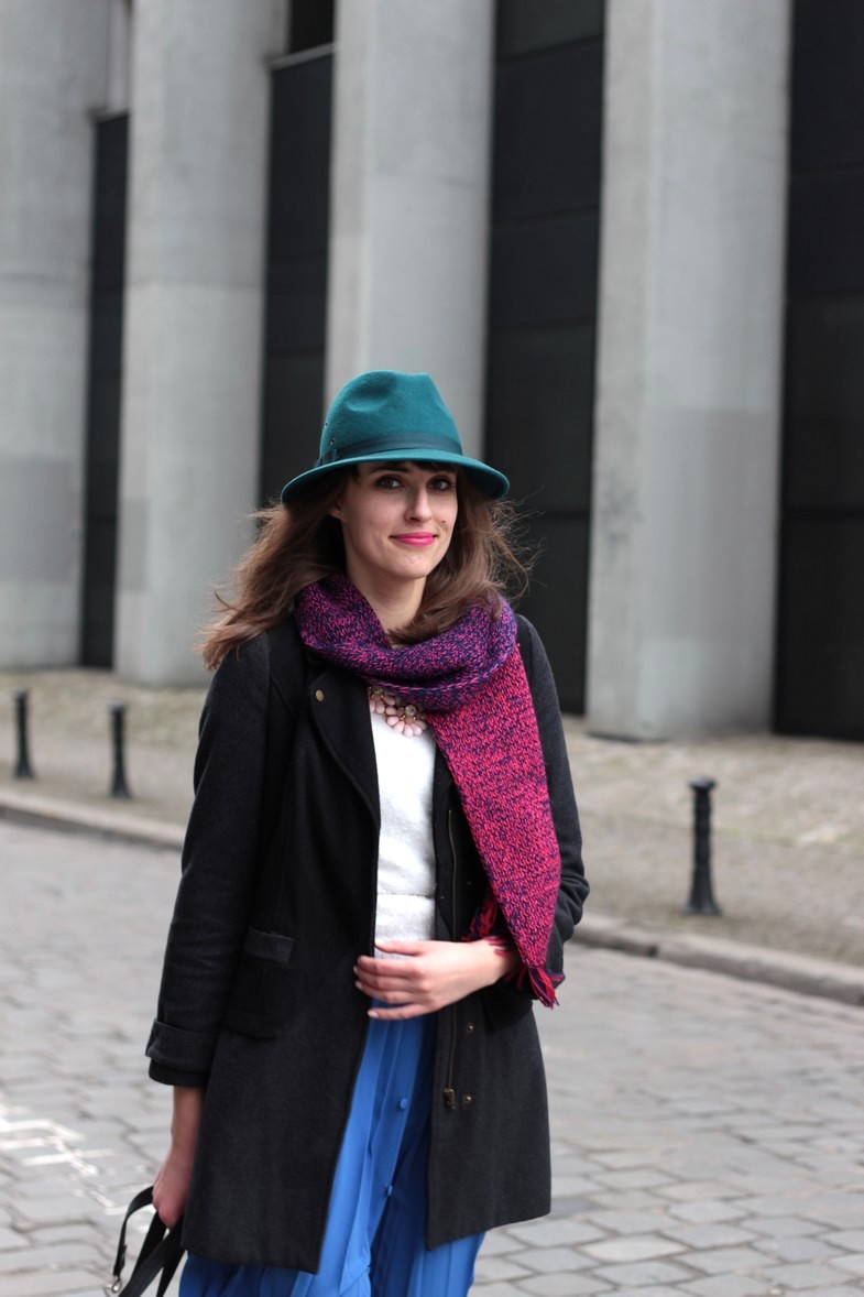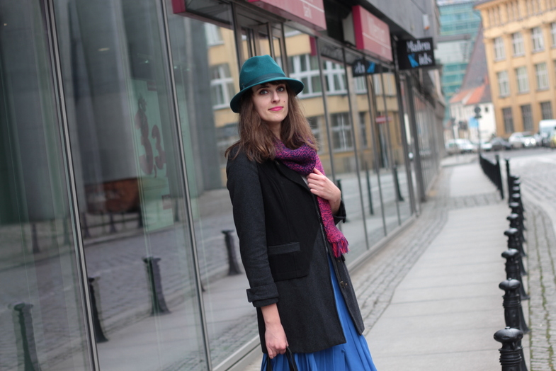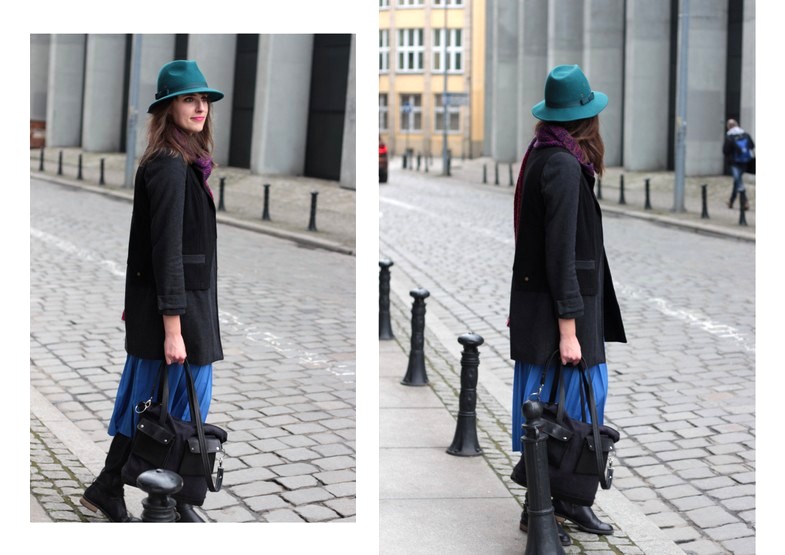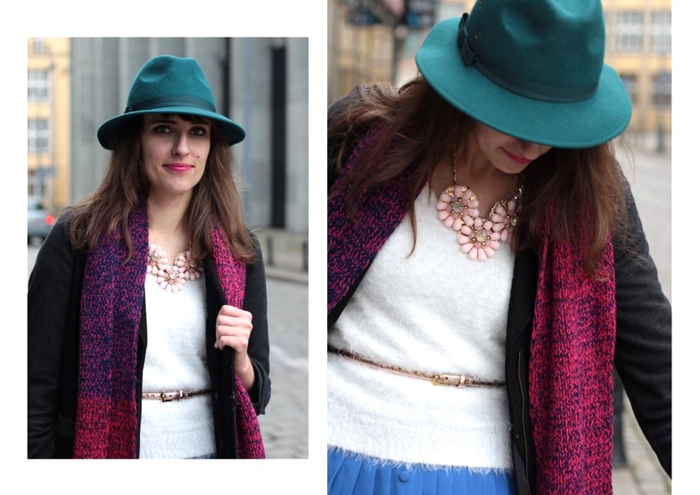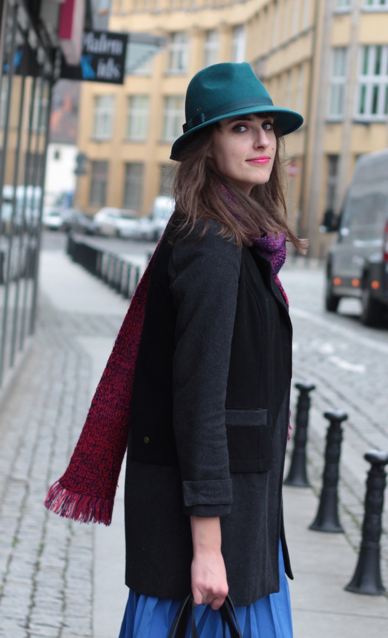 kapelusz / hat: MEDICINE | szal / scarf: HANDMADE | naszyjnik / necklace: CIUCHBUDA.PL | sweterek / sweater: F&F | płaszcz / coat: ZALANDO | spódnica / skirt: LABOUTIQ CAFE SH | buty / shoes: ZALANDO | torba / bag: IGNATOWICZ
