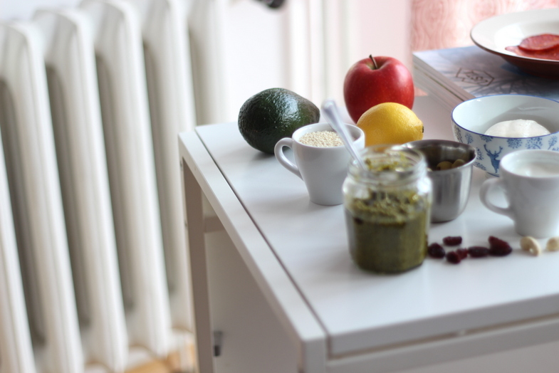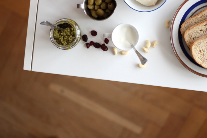 Klasyczne pesto możemy przyrządzić na podstawie przepisu z magazynu Kinfolk. Potrzebujemy dodatkowo: / 3 ząbki czosnku / duży bukiet świeżej bazylii / które siekamy razem. Do tego mała garść / orzechów pinii / niepełna szklanka startego parmezanu / i ponownie siekamy wszystko. Jeszcze tylko / kilka łyżeczek oliwy z oliwek / i pyszne pesto mamy gotowe!