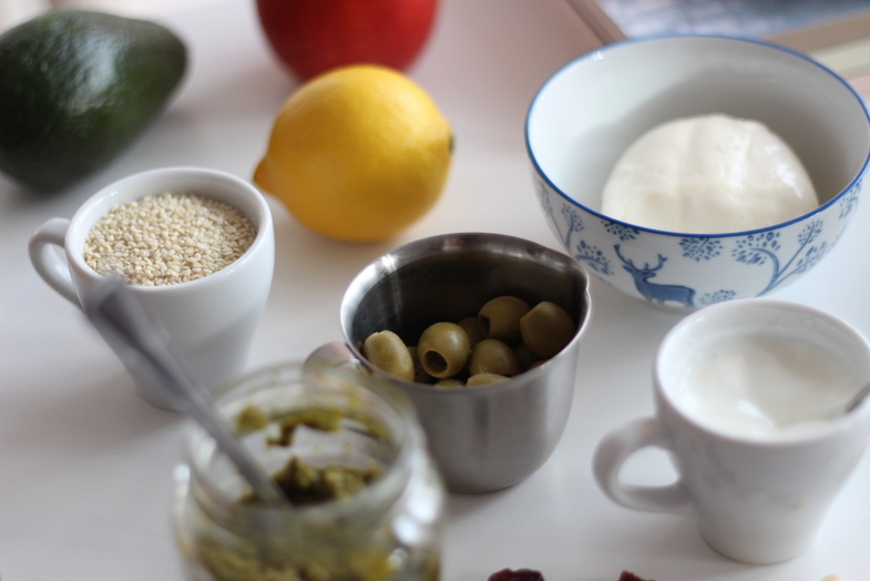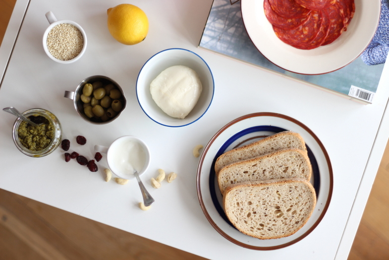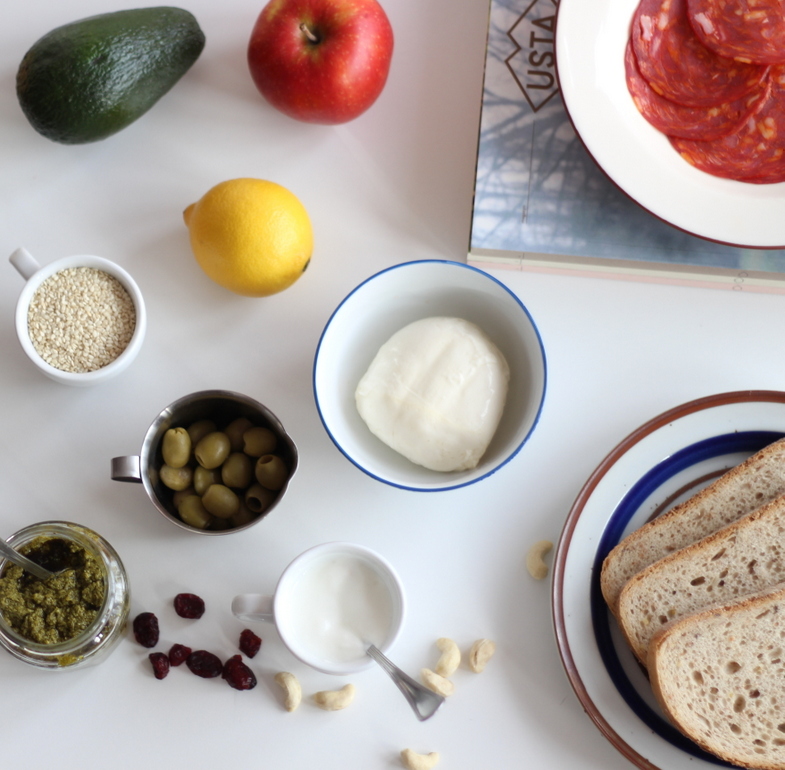 czerstwe pieczywo / 1 awokado / pół jabłka / cytryna / zielone oliwki / jogurt naturalny / pieprz / orzechy nerkowca / żurawina / chorizo (lub łosoś) / pesto / mozarella / sezam