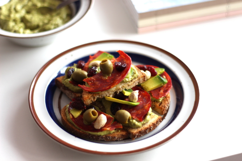Obrane ze skórki i pokrojone na nieduże kawałki miękkie awokado blendujemy z 3 łyżkami pesto oraz jogurtem naturalnym (ilość filiżanki do espresso) oraz połową jabłka. Doprawiamy całość pieprzem i kilkoma kroplami soku z cytryny. Kromki chleba dzielimy na 3 części, smarujemy masłem i posypujemy sezamem, a na wierzch kładziemy cienki plaster mozarelli (można też ten składnik pominąć). Pieczywo podpiekamy w nagrzanym do 150 stopniu piekarniku. Ewentualnie używamy tostera. Na grzanki nakładamy krem z awokado, chorizo (lub łososia), oliwki, orzechy nerkowca i żurawinę. Podajemy jeszcze ciepłe, ale pyszne są także na zimno.