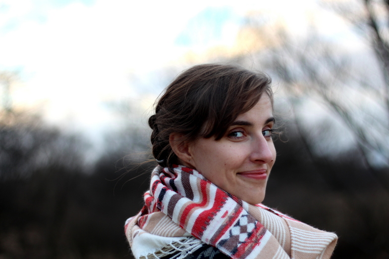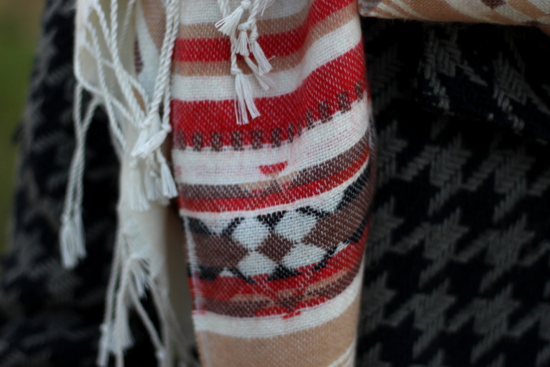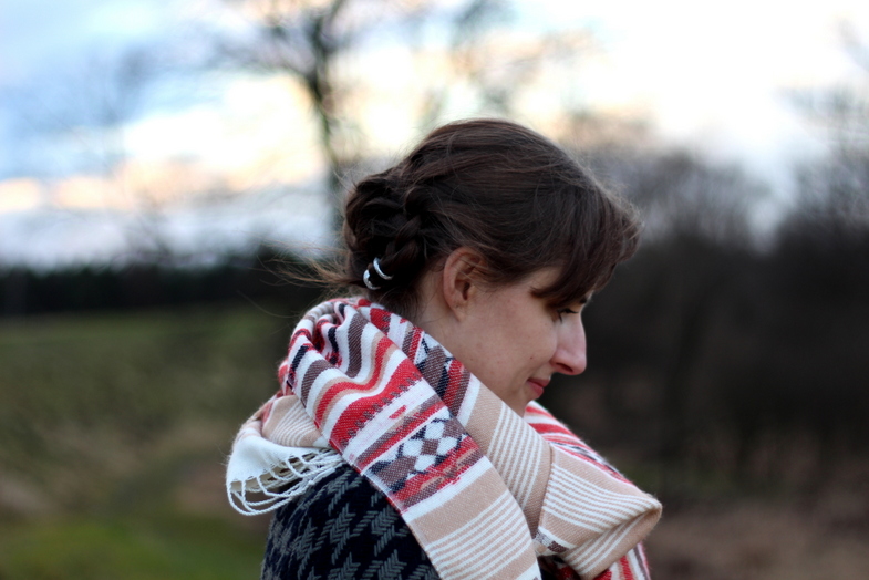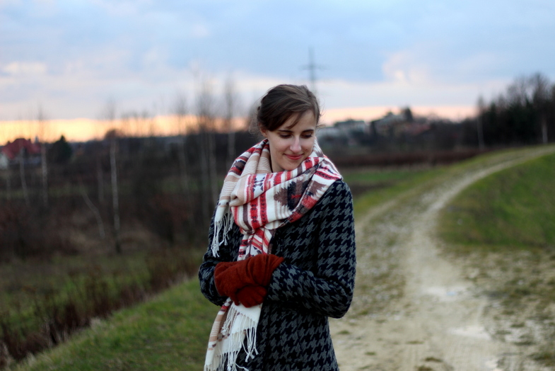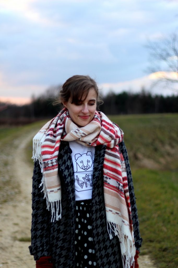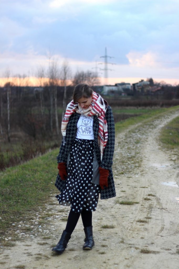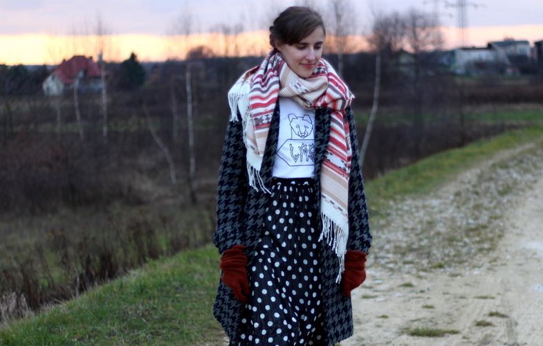 Ja zdecydowałam się na mix wzorów. Do płaszcza z New Yorkera, który wisi w mojej szafie już dobre 7 lat, dobrałam pożyczoną od siostry zwiewną spódnicę w grochy, prosty t-shirt Las, szary sweter i motocyklowe botki (w sam raz na błotniste wiejskie wycieczki!). Do tego ciepły szal w stylu boho, który dostałam pod choinkę.