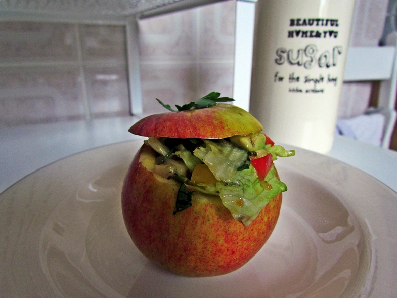 Warzywa myjemy. Odkrawamy niewielki kawałek jabłka od góry i wydrążamy środek. To co się da kroimy w drobną kostkę, pestki i ogryzek raczej wyrzucamy 😀 Kawałek papryki i 1/4 awokado kroimy w kostkę, sałatę rwiemy, a pietruszkę i część cebuli siekamy. Przygotowujemy sos na bazie oliwy z oliwek z ulubionymi ziołami i pestkami słonecznika. Wypełniamy jabłko sałatką. Gotowe!