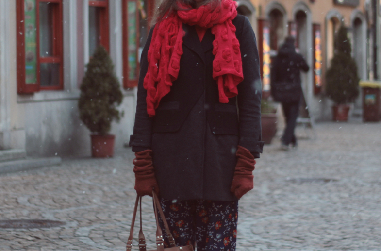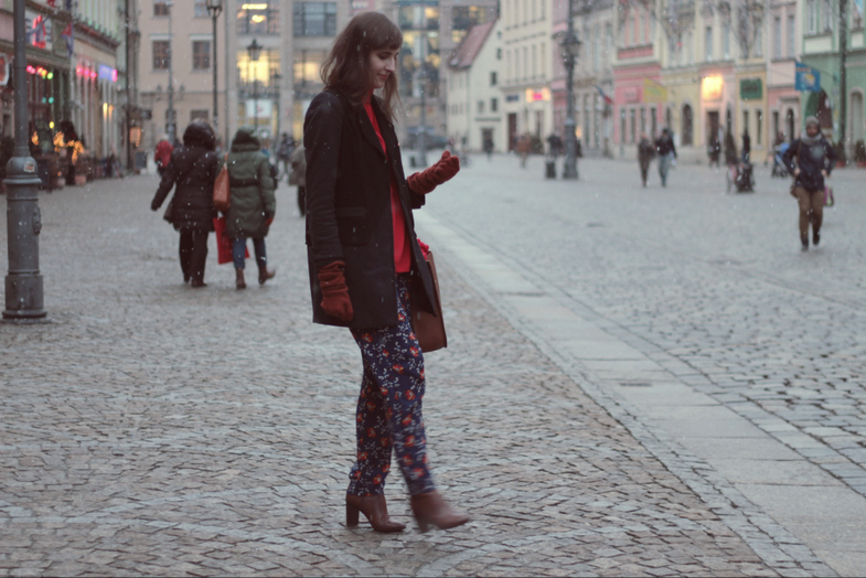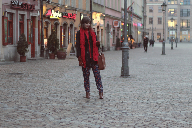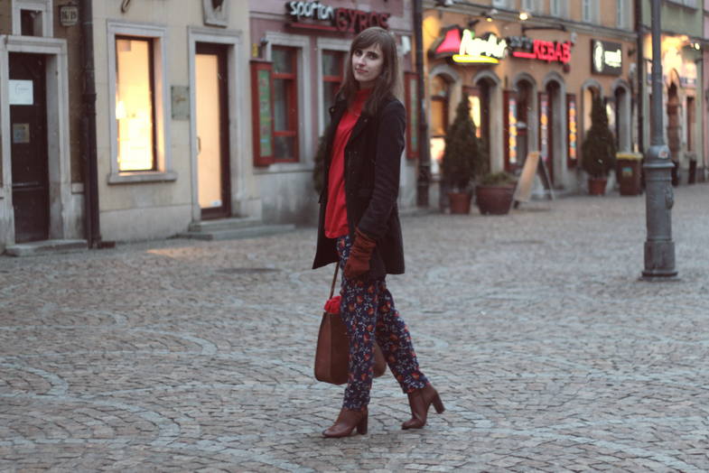 Ja, posługując się lekkim nawiązaniem do tych czasów, wybrałam mocny czerwony kolor oraz golf, ale nie dopasowany, tylko oversize. Do tego luźne spodnie w kwiaty i botki na słupku.