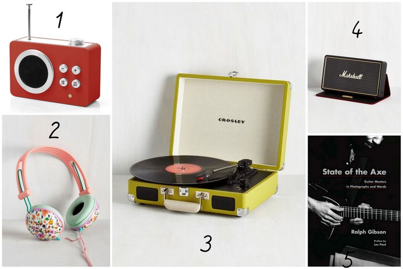 1. radio Fabryka Form | 2. słuchawki w pastelowych kolorach w kwiaty Modcloth | 3. odtwarzacz Modcloth | 4. głośnik Modcloth | 5. książka Bookoff