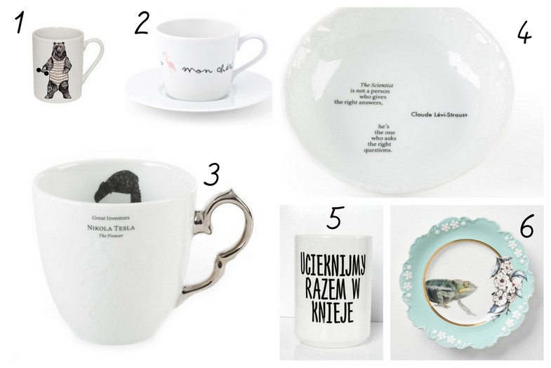 1. kubek miś tatuażysta Bajki Opowiadasz | 2. porcelana Kristoff Mon Cheri projekt Magdy Pilaczyńskiej | 3. 4. Porcelana Kristoff | 5. kubek ucieknijmy w knieje Sloshe | 6. ozdobny talerz Anthropologie