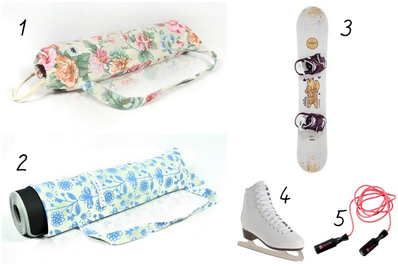 1. 2. torba na matę do jogi Studio Namaste | 3. deska snowboardowa Decathlon | 4. łyżwy Decathlon | 5. skakanka Decathlon