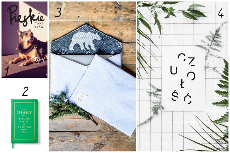 1. kalendarz naścienny Pieskie życie | 2. kalendarz Kate Spade | 3. etui na tablet lub dokumenty risk made in warsaw | 4. plakat Beleco Czułość