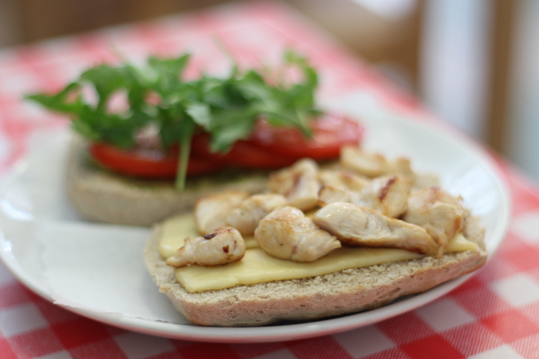 Zamówiła kanapkę z kurczakiem, awokado (czy to mango było?), rukolą, serem i pesto.