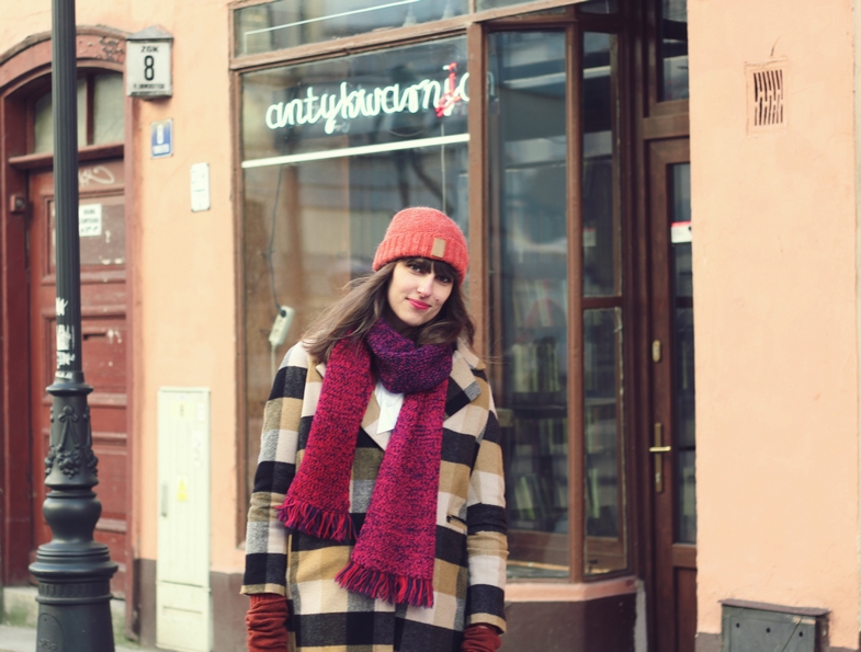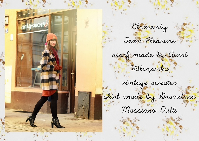 czapka / cap: ELEMENTY | płaszcz / coat: FEMI PLEASURE | szal / scarf: wydziergany przez Ciocię / made by my Aunt | sweter / sweater: vintage SH | koszula / shirt: WÓLCZANKA | spódnica / skirt: uszyta przez Babcię / made by my Grandma | torebka / bag: TOREBKI ENERGETYCZNE OD IRIS | botki / boots: MASSIMO DUTTI | okulary przeciwsłoneczne / sunglasses: QUAY AUSTRALIA
