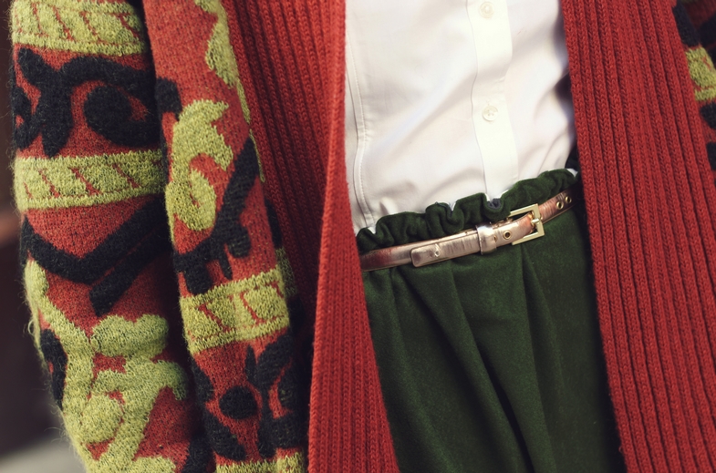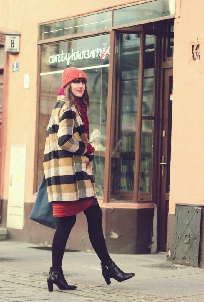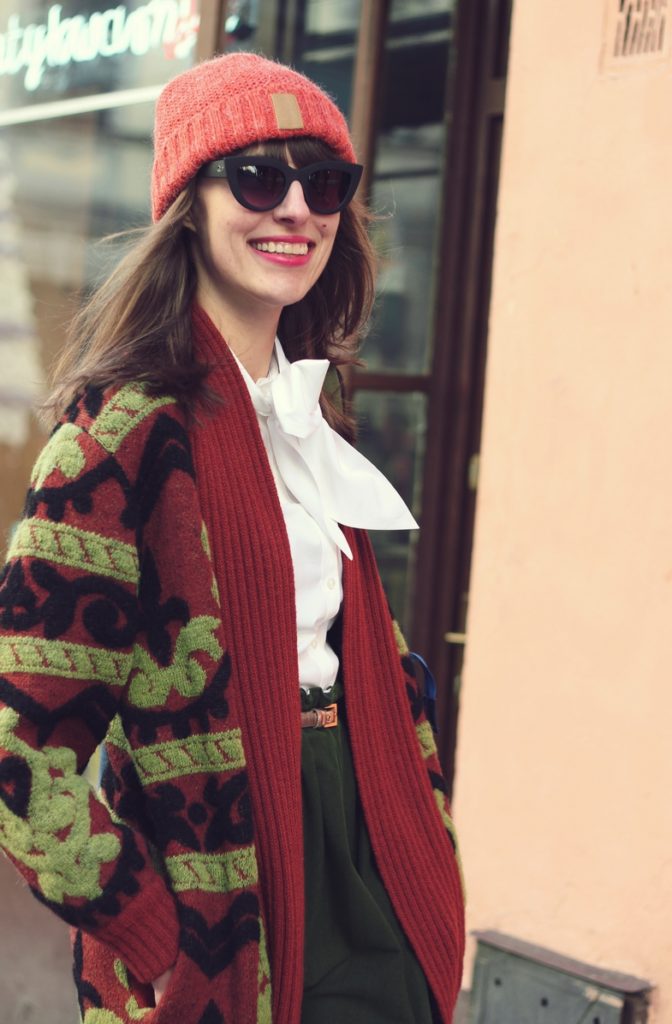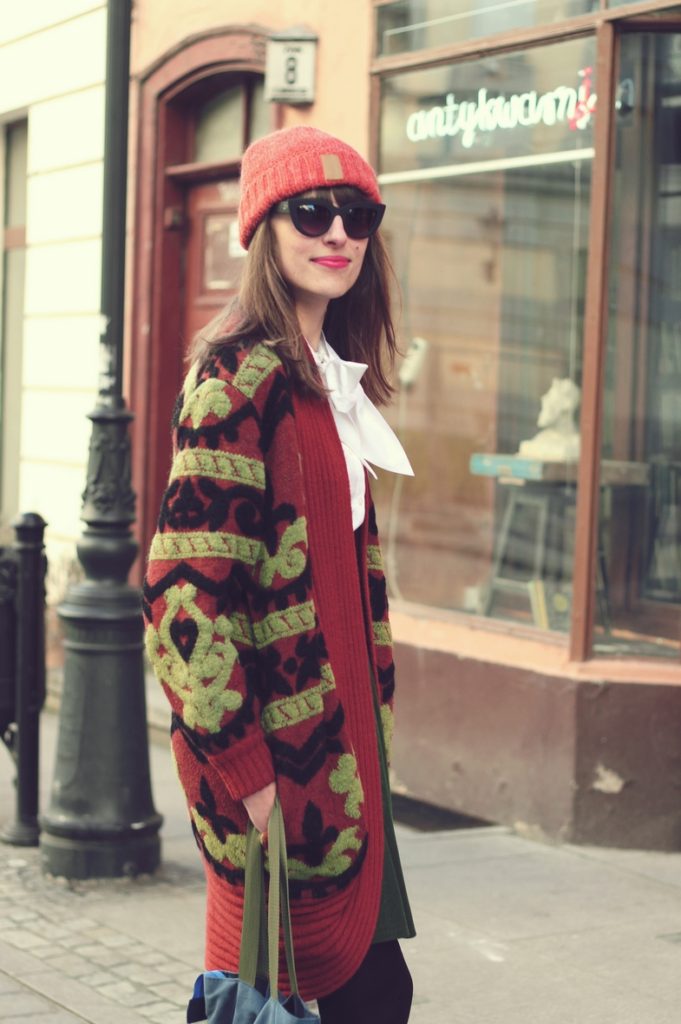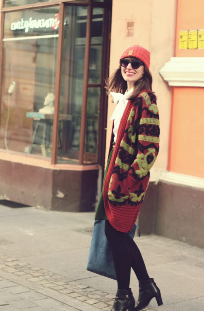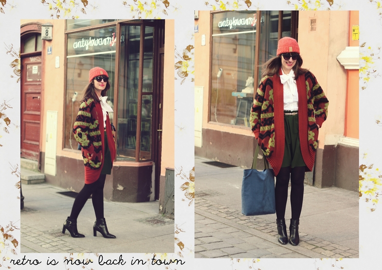 Zestaw, który widzicie to eklektyzm w czystej postaci. Koszulę można zakładać będąc finansistką w ważnym banku, płaszcz, którego nie powstydzą się bywalczynie stoków narciarskich, babciny sweter, a do tego retro okulary i botki pasujące do boyfriendów i innych must have’ów streetstyle’u (fujka, ale łamńce angielszczone). U mnie tworzą wybuchową mieszankę w stylu vintage.