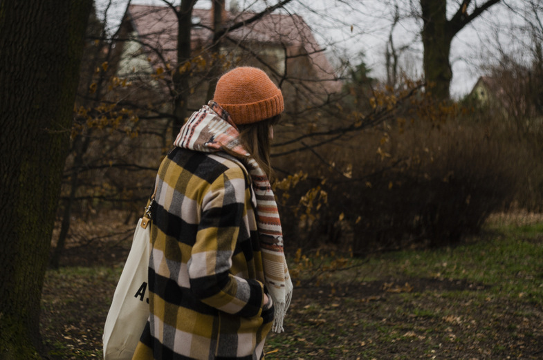 Zazwyczaj unikam brązów i wszelkich rudości, bo wydaje mi się, że moja cera nabiera wtedy ziemistego koloru, a całość dodatkowo ma jakąś dziwną żółtą poświatę. Odkąd jednak mam ten płaszcz w kratę, szal w etniczne wzory i przyjemną w dotyku czapkę – trochę się z barwami ziemi przeprosiłam. Tym bardziej, że jak się okazuje zdjęcia w takiej tonacji mają niesamowity klimat!
