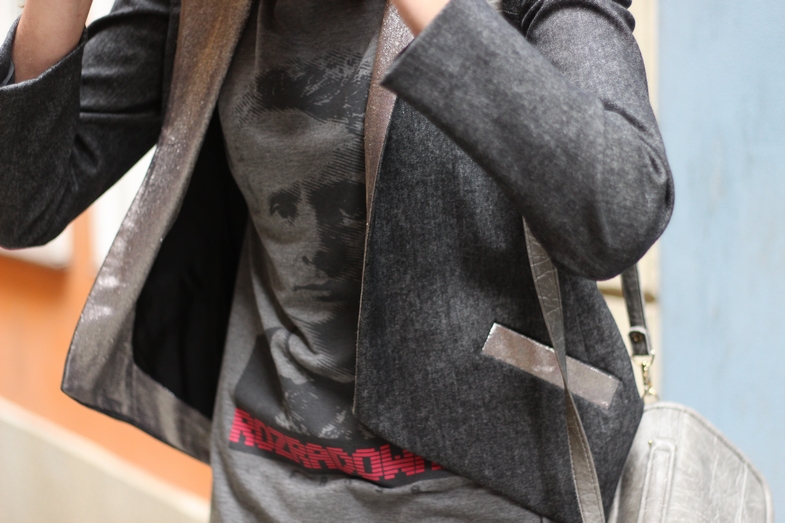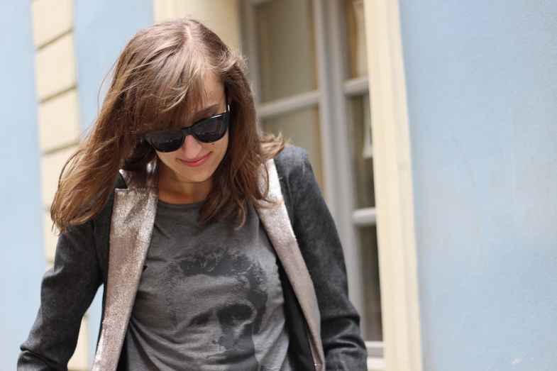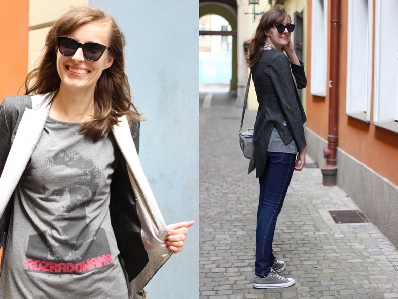 Marki w różny sposób się z nami komunikują, przekaz jednych trafia do nas bardziej niż innych. Są takie firmy, na które nigdy nie zwrócimy uwagi. Ja staram się być świadomym konsumentem, co oczywiście nie zawsze wychodzi. Ale nikt nie jest idealny, przynajmniej próbuję. T-shirt z Marią Skłodowską-Curie, który mam na sobie, kupiłam już kilka miesięcy temu, ale jakoś nie miałam okazji Wam go zaprezentować. Przyznam, że przekaz marki Farsa jest taki, że w 100% się w nim odnajduję. Po prostu tej firmie wierzę. Koszulki tworzone są w Polsce, przy użyciu ekologicznych farb, a design – zobaczcie sami! Gra słowem i świetne wykonanie. Do tego założyłam frak, który mieliście okazję zobaczyć tutaj. Kreatywne dziewczyny z FU-KU tworzą swoją autorską kolekcję fraków, a oprócz tego prowadzą sklep (stacjonarny i internetowy) z rzeczami polskich projektantów, we Wrocławiu stacjonują w Galerii na Czystej. Mój frak jest wykonany z materiału, który wygląda jak ciemny dżins i obszyty został srebrzystą, dyskotekową tkaniną. Bardzo go lubię!
