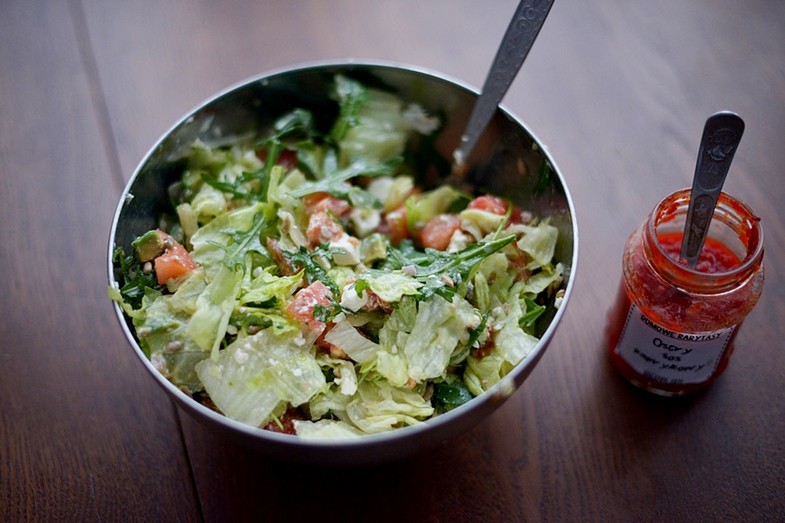 Wszystko co możliwe kroimy, słonecznik prażymy na rozgrzanej patelni. Łączymy ze sobą i polewamy sosem przygotowanym na bazie oliwy z oliwek. Coś pysznego!