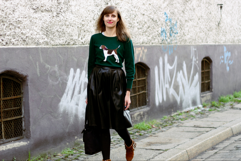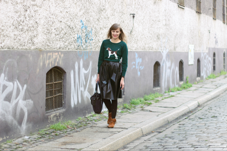 Żeby nie było zbyt uczniowsko, do sweterka w stylu preppy dobrałam spódnicę midi, ale skórzaną, zamiast klasycznych butów wybrałam moje hippie botki, a teczkę zastąpiłam torbą z zamszu. Dorzuciłam też trochę koloru, aby nieco szare dni rozjaśnić. Całość prosta i klasyczna, więc wizja prep została zachowana. Warto też nadmienić, że preppy to także swego rodzaju styl życia / subkultura. Schludność, uprzejmość, dbałość o kontakty społeczne, dużo uśmiechu i prostota to główne cechy, które określają ten styl bycia.