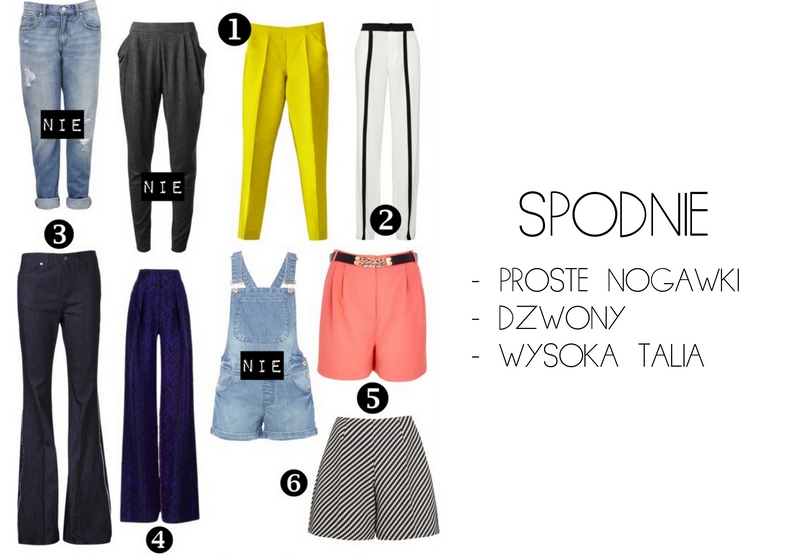 Spodnie typu bootleg czy z rozszerzanymi nogawkami (4. Roksanda Ilincic) albo dzwony (3. Stella Mccartney – szerokie nogawki równoważą biodra) będą najbardziej odpowiednie. Jednak i z prostych nie trzeba rezygnować. Przy wysokich obcasach i z wciętym w talii żakietem będą wyglądać ciekawie i nowocześnie (1. Ter et Bantine , 2. Etro). Szorty z podwyższoną talią to idealna propozycja na lato (5. brzoskwiniowe River Island, w ukośne wzory Carven). Jeśli mamy długie nogi to z powodzeniem możemy nosić rurki, pamiętając jednak o odpowiednim „ograniu” miejsca bioder 😉