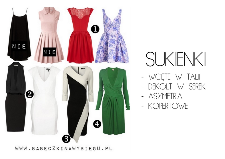 Klepsydra to figura stworzona przez siłę wyższą, do celów, a jakże, sukienko-spódnicowych. Pierwsza propozycja to klasyk – rozkloszowana sukienka wcięta w talii z dekoltem w kształcie serca (może być zabudowany jak w czerwonej sukience Oasis) lub serka/lejka (1. Zimmermannwear.com). W wersji dla odważnych – prosty, a nawet delikatnie zwężany dół, przy równoważeniu (wydłużaniu sylwetki) przez odpowiedni dekolt (2. czarna Victoria Beckham i biała Topshop). Dla minimalistek z artystycznym zacięciem model asymetryczny (3. Jane Norman). Na co dzień idealnie sprawdzą się sukienki kopertowe (4. By Issa). Ciekawe wersje dla nowoczesnych wielbicielek dresu proponują młodzi, polscy zdolni, np. Give me five.