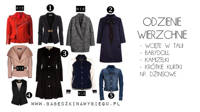 Jeśli klepsydra jest na tyle odważna, że chce podkreślać swoje piękne kształty, to jak najbardziej powinna nosić wcięte w talii żakiety, najlepiej zapinane na jeden guzik (1. Versace) oraz jednorzędowe płaszcze (3. Temperley London) i kamizelki (4. Ted Baker). Dla tych, którzy się lekko ukrywają, fajną opcją będą płaszcze rozszerzane, kojarzące się ze stylem babydoll (2. Marc Jacobs), kurtki kończące się za biodrami, albo np. dżinsowe katany zwężające się przy talii (5. Aeropostale).