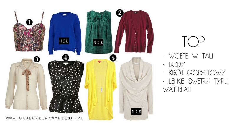 Przy odzieniu na górną część ciała chyba już zbyt dużo tłumaczyć nie trzeba. Cardigan z lejącymi połami skrzętnie ukryje newralgiczne biodra i wysmukli sylwetkę (5. Rene Derhy) Krótkie swetry typu oversize, albo kończące się tuż nad biodrami tylko je optycznie powiększą. Dobrze sprawdzą się wszelkie gorsetowe kroje (1. Miss Selfridge – taką talią trzeba się chwalić!) i bluzki z zaakcentowaną talią (3. House of Fraser, 4.Paule Ka). Powtarzalnym motywem powinno być stosowanie przez klepsydrę dekoltów w kształcie serka (2. Target).