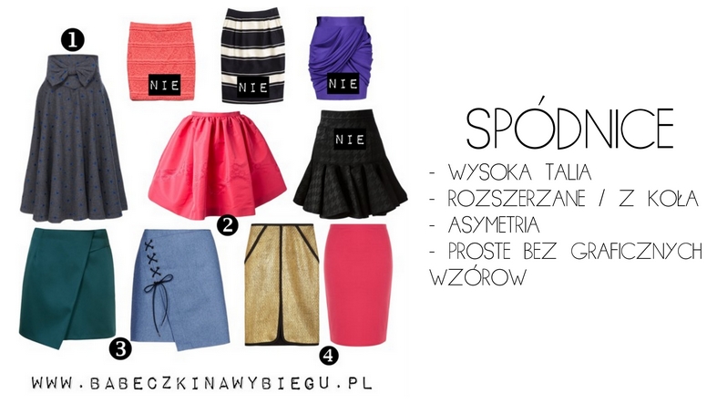 Podobne rady jak powyżej stosujemy w kwestii spódnic. Wąska talia (1. pariscoming.com), rozkloszowane (2. Red Valentino) i asymetria (3. Topshop, Vanessa Bruno). Dopasowane spódnice podkreślą co trzeba (4. różowa Dorothy Perkins, złota, której przeszycia optycznie wydłużają sylwetkę i zmniejszają biodra Jonathan Simkhai). Z polskich propozycji warto zwrócić uwagę na taliowane spódnice z zakładkami i charmsem marki Made Line.