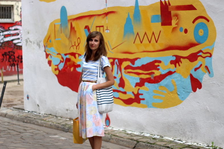 t-shirt: GINA TRICOT | spódnica /skirt: SECOND HAND | płócienna torba / cotton bag: H&M | buty / shoes: KEDS