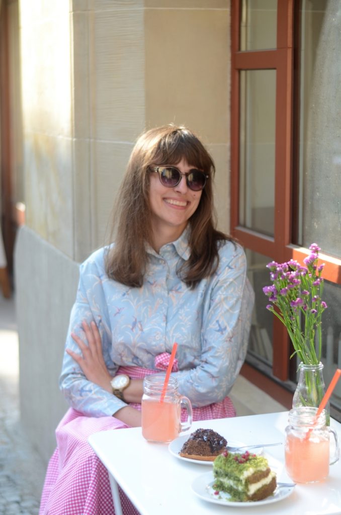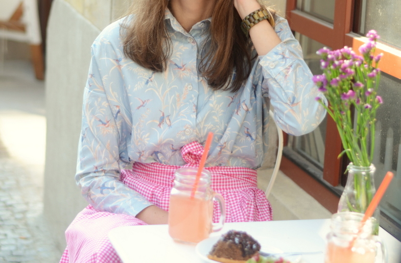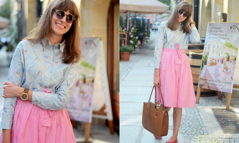 Good alternative for shops we can find in shopping centres is polish brand ANOI which offers nice and comfortable clothes. What is important the designer uses also recykling. I chose light blue shirt with birds and ears of cereal. Pink skirt in very fashionable pattern – vichy (gingham) check suits my fancy for retro style. It was made by Mum. To this look I added big leather bag designed by family brand DZIKI JÓZEF.