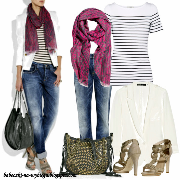| t-shirt Oasis, marynarka Elizabeth and James, dżinsy D&G, buty reissonline.com, torba Antik Batik, szal Matthew Williamson |