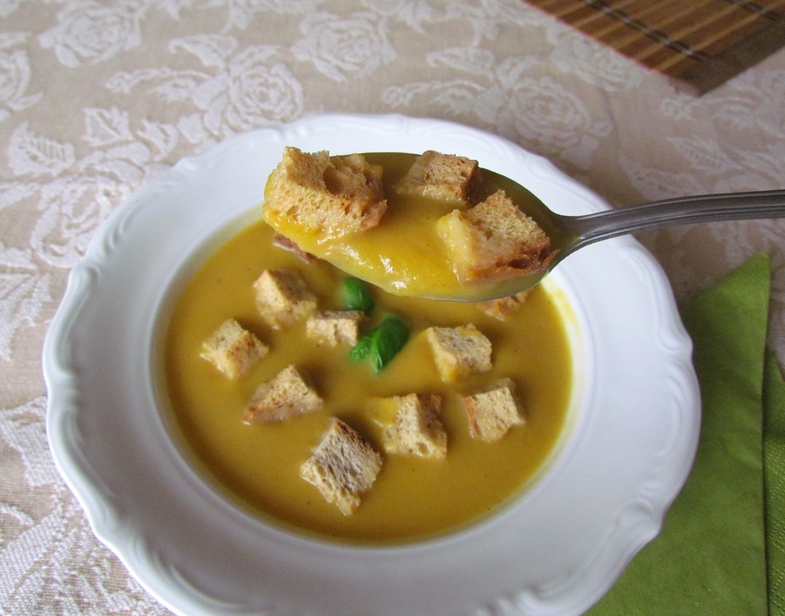 Dynię kroimy w kostkę. Na patelni trzeba zeszklić cebulę na maśle, Następnie dorzucamy do niej dynię. W tym czasie przygotowujemy bulion warzywny. Do bulionu dodajemy podsmażoną dynię z cebulą oraz wyciśnięty przez praskę czosnek. Gotujemy, aż dynia będzie miękka. Później całość blenderujemy. Wlewamy mleko i gotujemy jeszcze chwilę. Doprawiamy. Wlewamy na talerz, dodajemy grzanki i bazylię do dekoracji. Smacznego!